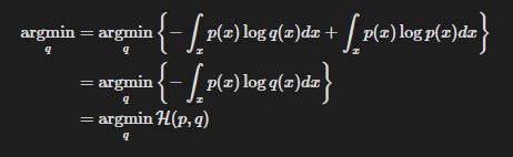 실제 데이터의 분포가 p(x)로 주어지고, 이를 q(x)로 추정하고자 할 때 해당 데이터 집합에서 p(x)는 고정이므로(물론 알지는 못하지만) p(x)와 유사한 q(x)를 계산하는 것을 다음과 같이 생각할 수 있다.