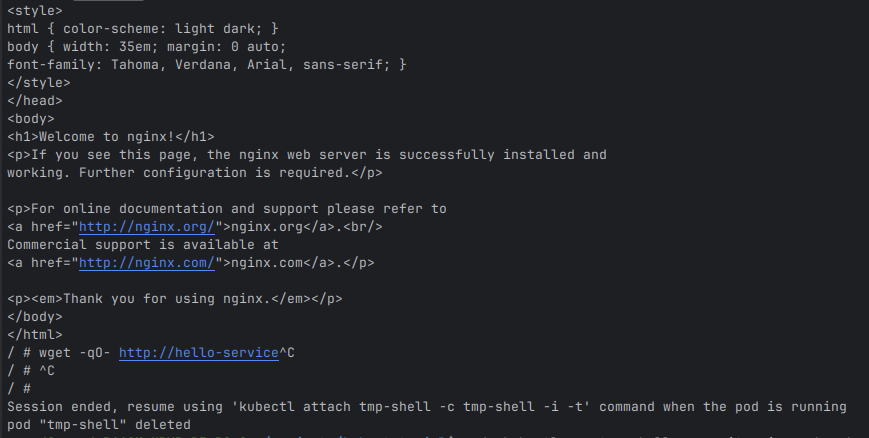 결과로 Nginx의 기본 페이지 HTML이 출력되면 서비스 통해 Nginx Pod들과 통신이 잘 된다.