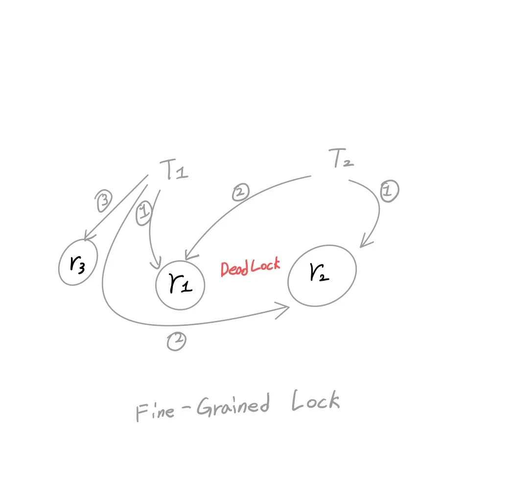 기존 하나의 잠금으로 관리하던 r1과 r2 의 잠금이 분리되었고, T1과 T2는 각기 다른 순서로 각 리소스의 잠금을 요구하게 되었다. 그 결과, 예상치 못한 데드락이 발생하였고, 충돌의 해결을 요구하는 상황에 직면하게 되었다.