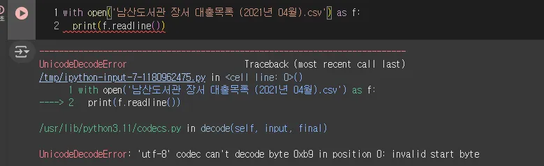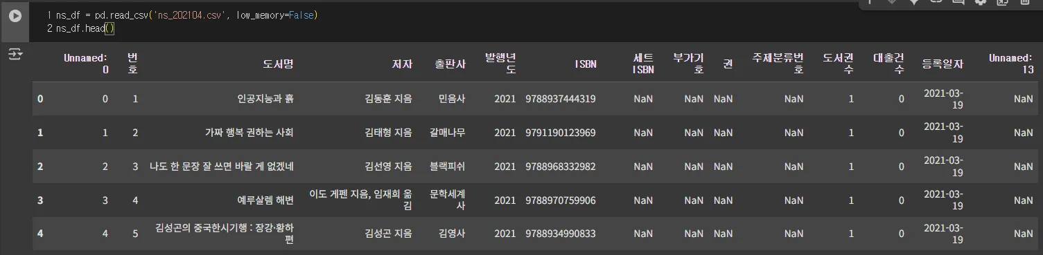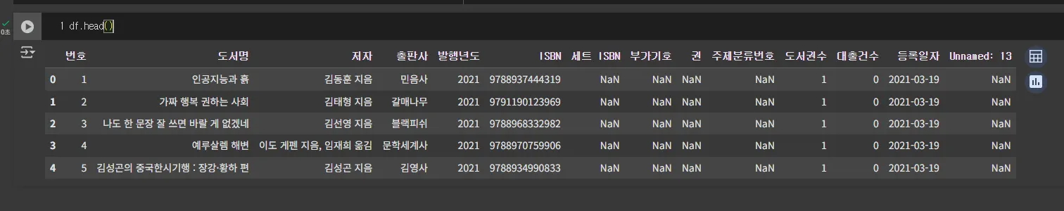판다스는 첫번째 행을 열 이름으로 인식한다. 이 예시에선 "번호, 도서명, ..." 들이 열 이름으로 인식되어 데이터프레임을 구성하게 된다.
