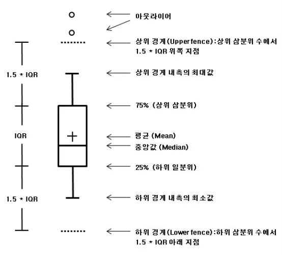 여기서 제 1사분위수와 제3사분위수 사이의 거리를 IQR(interquartile range) 라고 한다.