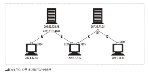 위 예시에서 A, B, C, D 각각의 연결은 발신지·수신지 IP 및 포트 번호가 달라 서로 구분이 가능하다.