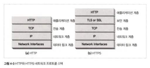 HTTPS는 위의 HTTP 네트워크 프로토콜 스택에 SSL/TLS를 위한 보안 계층을 추가한 프로토콜이다. SSL/TLS 계층에서 암호화, 무결성 보장, 인증 등의 과정을 거친 후에 TCP 계층에 데이터를 전달하기 때문에, 일반 HTTP보다 연결 과정이 조금 더 복잡하고 느리다.