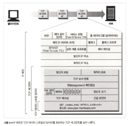 - 네트워크 계층에서 전송되는 데이터 블록이다. IP 패킷에는 IP 패킷 헤더(보통 20바이트), TCP 세그먼트 헤더(보통 20바이트), 그리고 TCP 데이터가 포함된다.