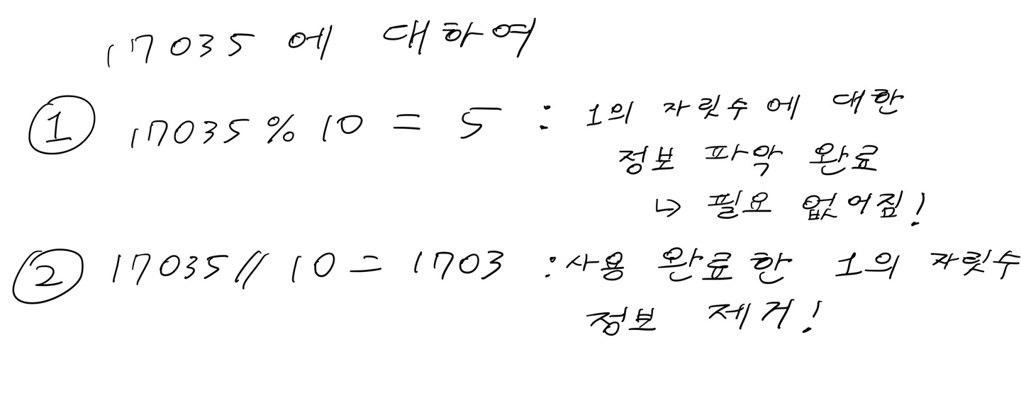 또한, 10으로 나눈 몫만 구하면, 기존에 있던 1의 자릿수의 정보가 날아가고, 나머지 자릿수들의 정보만 남길 수 있다.