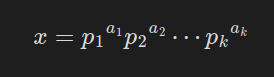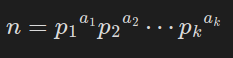 여기서 p_i는 서로 다른 소수이고, a_i는 양의 정수이다.