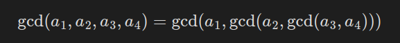 GCD와 LCM은 결합법칙을 만족하므로 여러 수의 GCD/LCM을 계산할 때 순서에 상관없이 2개씩 묶어서 계산하면 된다.