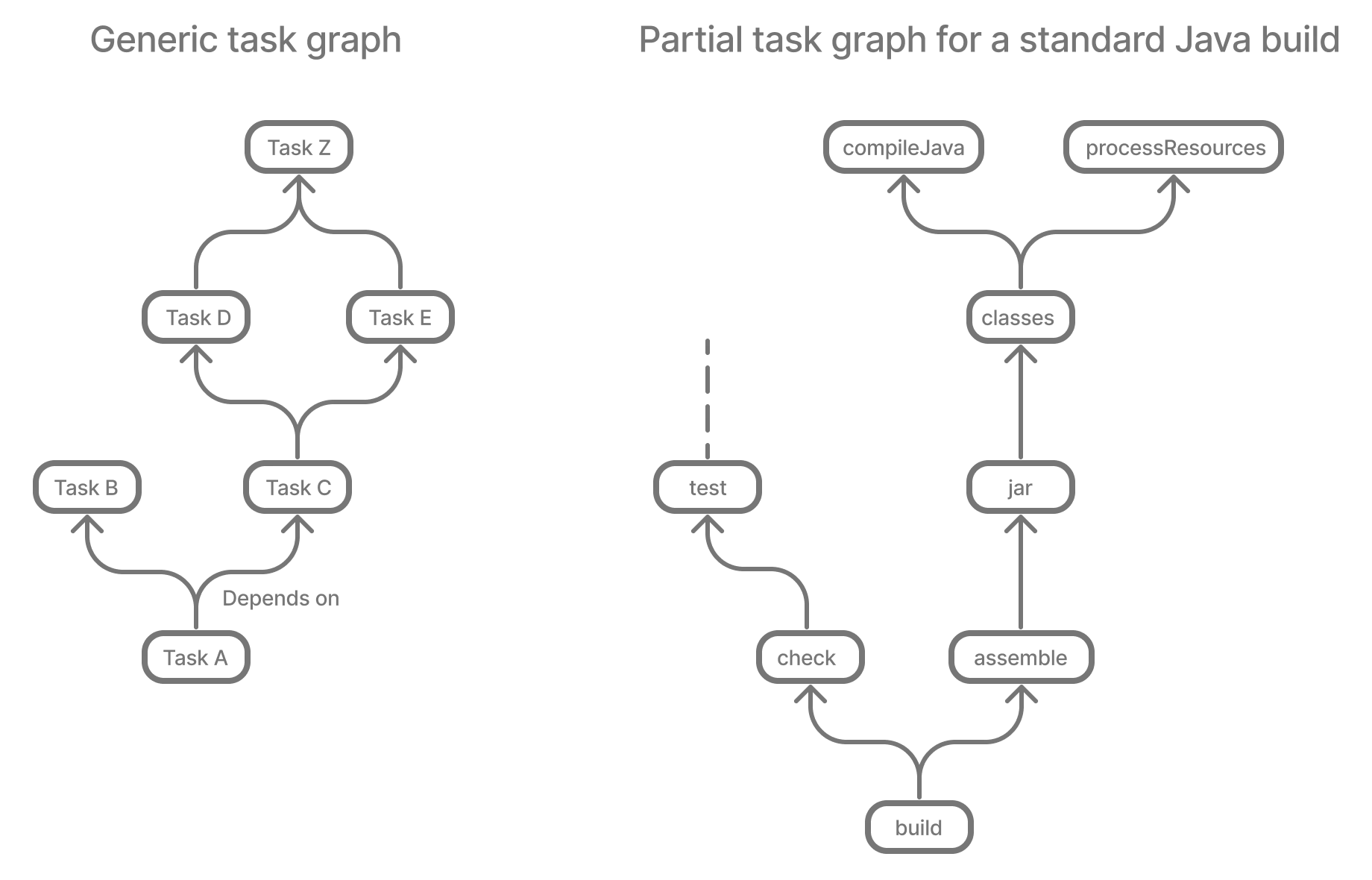 - Gradle은 모든 가용 작업에 대한 의존 그래프를 생성하여, 의존성 관계를 풀어낸다.