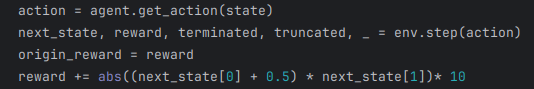- 단순히 가운데에서 멀리 떨어지고, 속도가 빠를수록 보상으로 추가하기