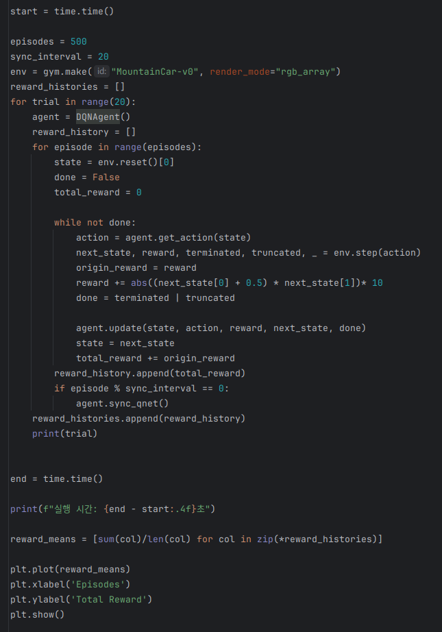 - 종료 : 차량의 위치가 0.5 이상(오른쪽 언덕 위의 목표 위치)