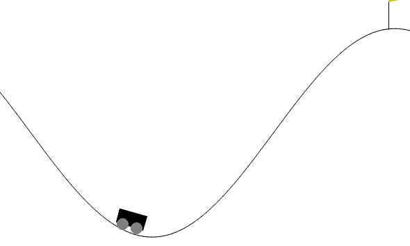 목표는 가능한 한 빨리 오른쪽 언덕 위에 놓인 깃발에 도달하는 것인데, 이를 위해 에이전트는 각 타임스텝마다 -1의 보상을 받으며 페널티를 받는다.