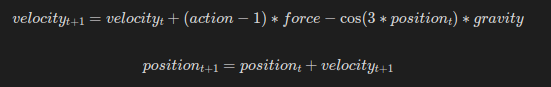 MountainCar 의 다음 상태 전이를 나타내는 'step' 함수는 특정 행동했을 때 결과인 새로운 관찰(obsType)을 건네받는다.