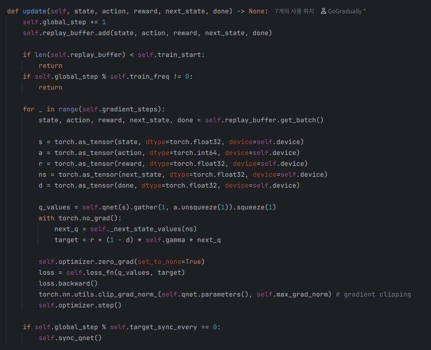 - 강화학습은 episode 별로 진행되지 않고, steps 별로 진행된다.