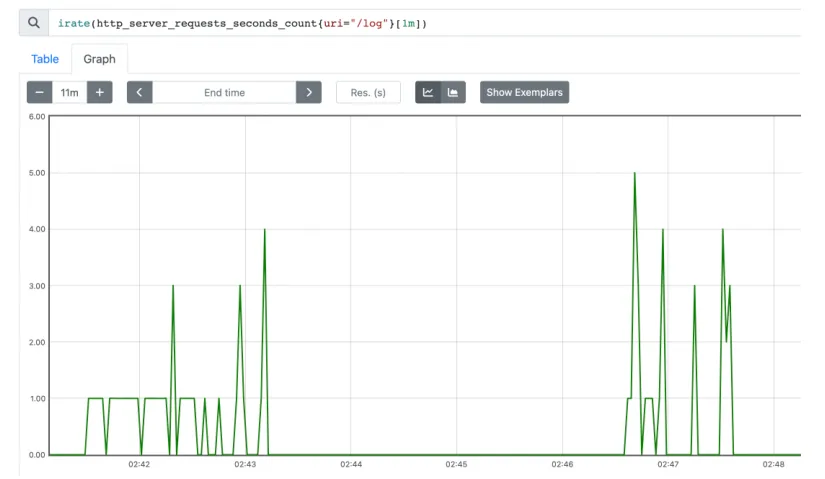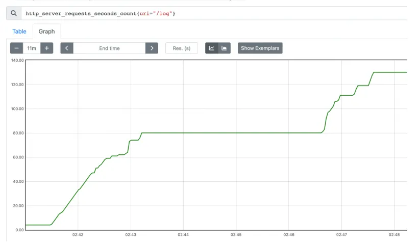 - http_server_requests_seconds_count{uri="/log", method="GET"}