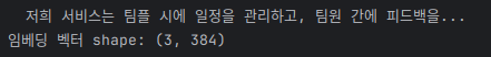 all-MiniLM-L6-v2 모델의 출력 차원이 384이므로 (모델마다 다름), 문서 3개라면 embeddings.shape는 (3, 384)처럼 나올 것이다.