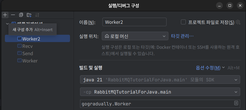 다음과 같이 좌측 상단의 '새 구성 추가'를 이용해, 병렬로 수행할 새로운 Worker를 생성하고 실행해보자.