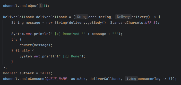 이 문제를 해결하려면 basicQos메서드를 prefetchCount=1 매개변수와 함께 사용할 수 있다.