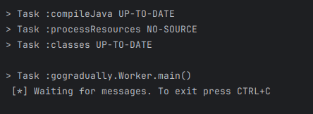 이제 이 NewTask를 실행하면, 아래와 같이 워커에서 5초가 걸린 뒤 작업이 완료되는 모습을 확인할 수 있다.