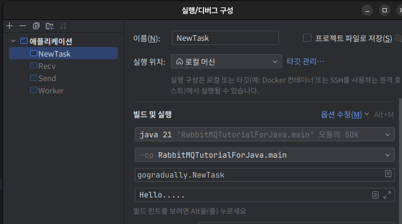 실행하기 전에, 메시지를 실행할 때 인수로 넘겨줘야 하므로, 실행 구성을 편집을 수행해야 한다.