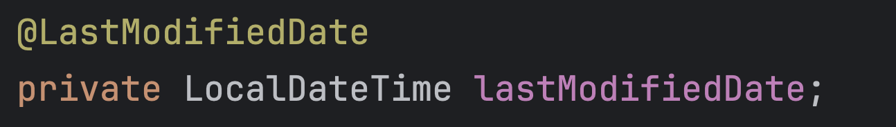 스프링 데이터 JPA Audit은 자주 사용되는 Audit 데이터에 대한 다음 네가지 기본 형식을 어노테이션으로 지원한다.