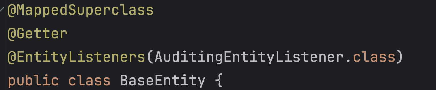 이는 감사를 받는 모든 엔티티가 가지고 있어야 하므로, 감사 데이터를 저장하는 BaseEntity에 지정한다.