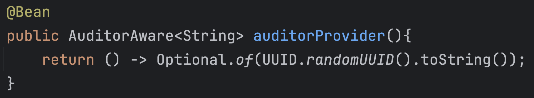 이는 다음과 같이 스프링 빈 auditorProvider으로 지정할 수 있다.