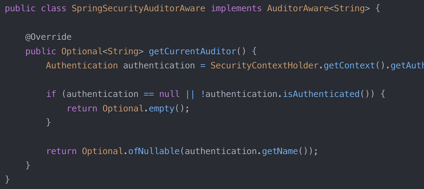 이제 등록자/수정자를 저장하는 방법을 알기 전에, 먼저 등록자/수정자를 어떻게 저장하는지를 Auditing 시스템에 알려야 한다.