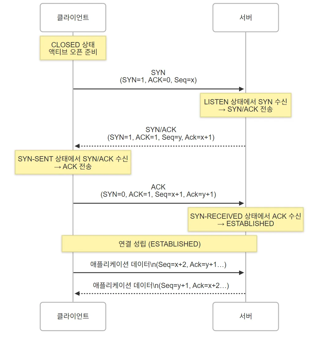 - 3번의 통신과정을 거쳐, 연결을 수립하는 과정을 의미한다.