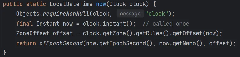 실제로 now() 메소드는 now(clock) 을 호출하고, clock 에 담긴 정보를 바탕으로 현재 시간을 불변 객체로 반환하게 된다.
