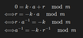 따라서, 다음 식으로 모듈러 역원을 구할 수 있다.