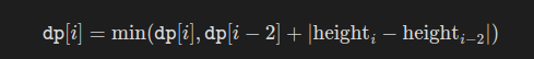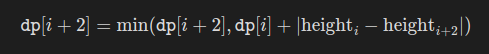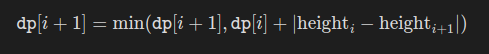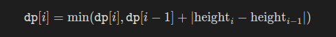 dp[i]를 “돌 i에 도착하는 데 필요한 최소 비용”이라고 정의하면, 점화식은 다음과 같다.