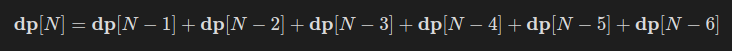 마지막 눈이 2라면 dp[N-2]개, 이런 식으로 6까지 모두 고려하면 다음을 얻게 된다.