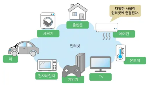 - 주변에 있는 다양한 것들이 인터넷에 연결된 구조를 의미한다.