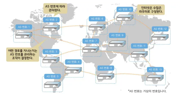 - 각 ISP에는 AS 번호(AS Number)가 할당된다.