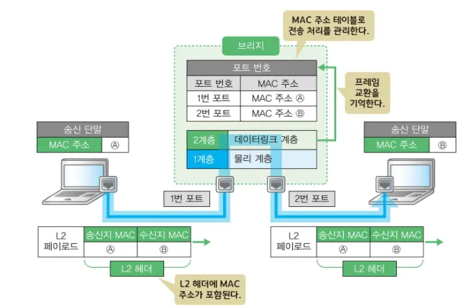 - 포트와 포트 사이의 '다리' 역할을 수행한다.