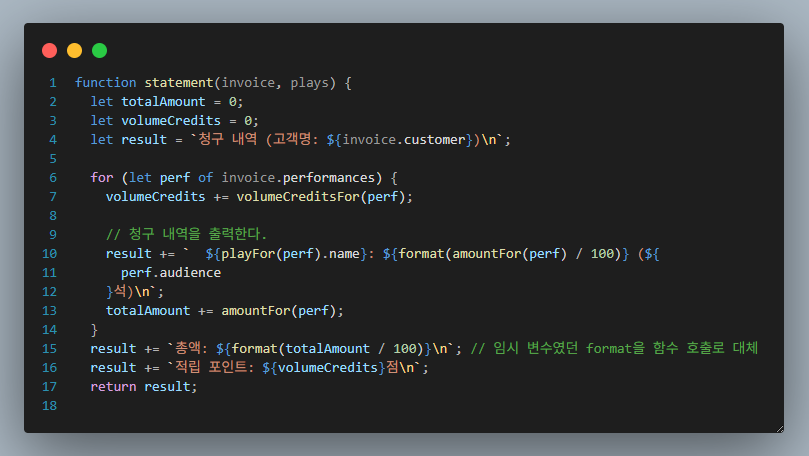 추가된 코드 덕분에 전체 로직을 구성하는 요소 각각이 더욱 뚜렷이 부각되고, 계산하는 부분과 출력 형식을 다루는 부분이 분리됐다.
