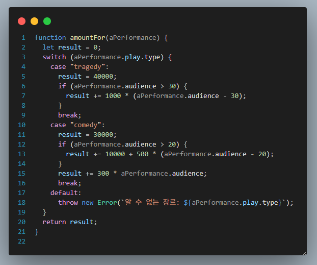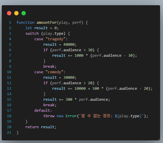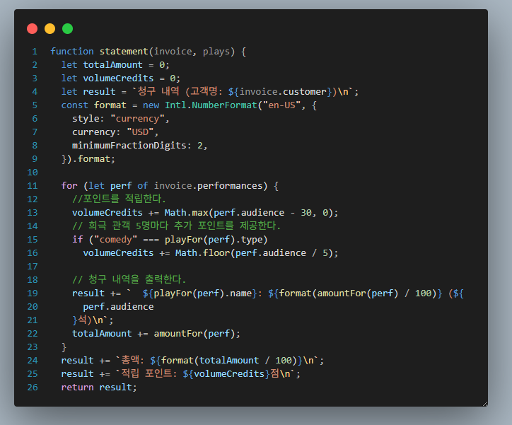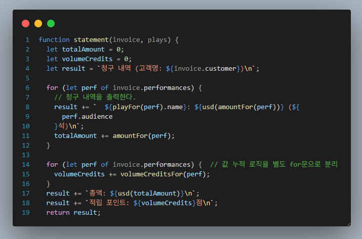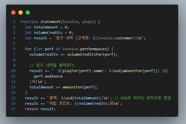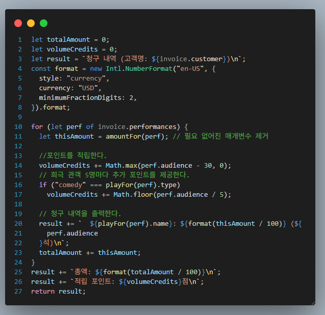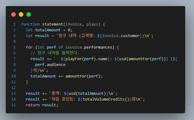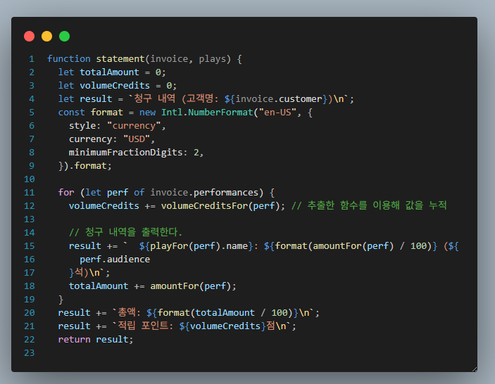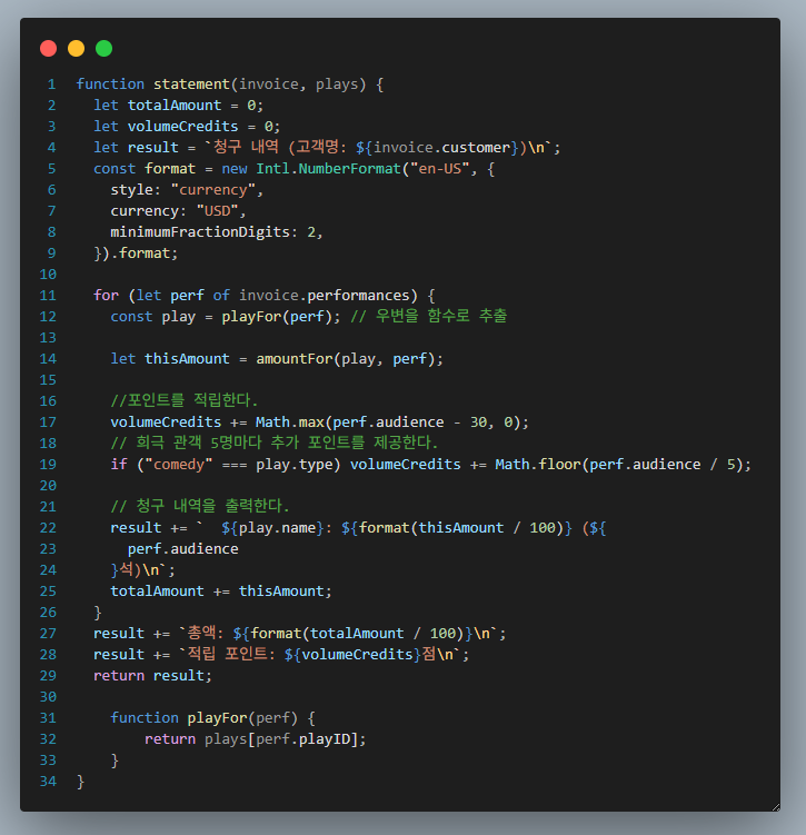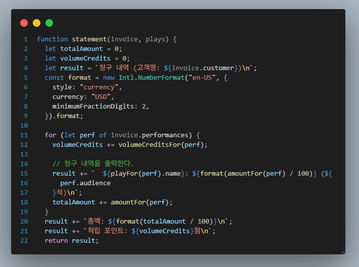 현재 이 함수는 조건부 로직을 포함한 함수인 amountFor()와 volumeCreditsFor()를 호출하여 공연료와 적립 포인트를 계산한다.