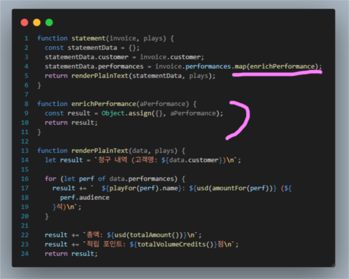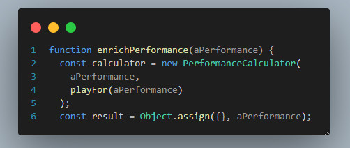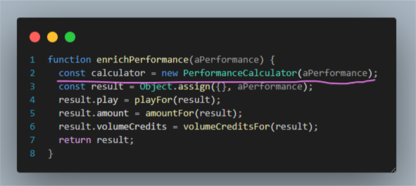 이후 enrichPerformance에 존재하는 원래 함수를 인라인(6.2절)하여 새 함수를 직접 호출하도록 하자.