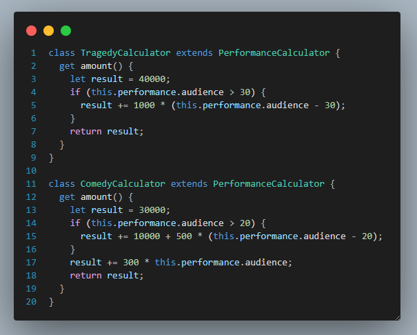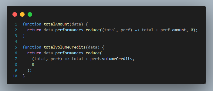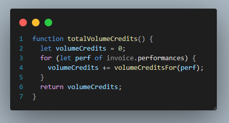 그리고 공연료와 별개로 포인트(volume credit)를 지급해서 다음 번 의뢰 시 공연료를 할인받을 수도 있다. 일종의 충성도 프로그램인 셈이다.