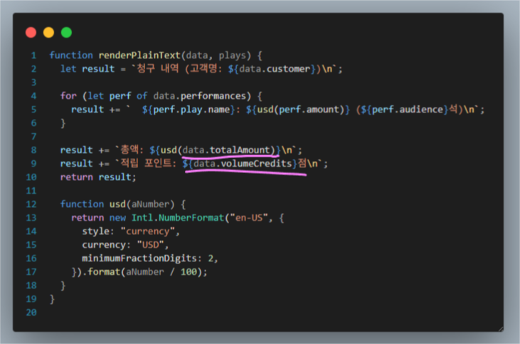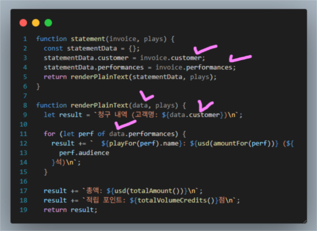 이 인수들을 통해 전달되는 데이터를 모두 방금 만든 중간 데이터 구조로 옮기면, 계산 관련 코드는 전부 statement() 함수로 모으고 renderPlainText()는 data 매개변수로 전달된 데이터만 처리하게 만들 수 있다.