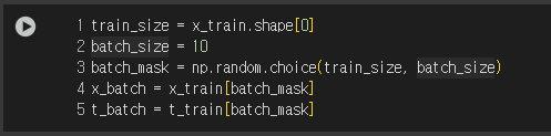 즉, 매번 6만개의 데이터에서 임의로 100개의 데이터를 추려내서, 해당 100개의 데이터로 SGD를 수행해 매개변수를 갱신했다.