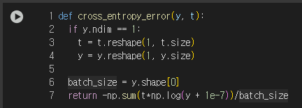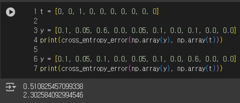 현재 정답 레이블은 t[2] 인데, 두번째 인덱스의 값이 더 큰(0.6 > 0.1) 첫번째 y가 더 낮은 손실함수 값을 출력하는 것을 확인할 수 있었다.