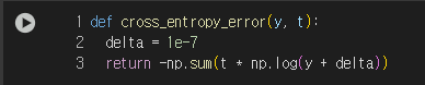 또 다른 자주 쓰이는 손실 함수로는 크로스 엔트로피 오차(Cross Entropy Error, CEE, 교차 엔트로피 오차)가 있다.