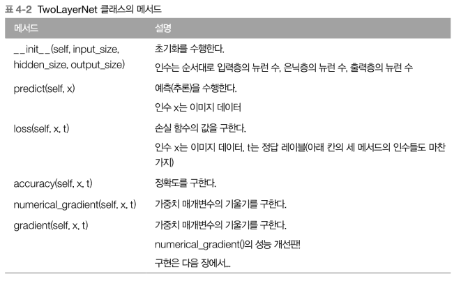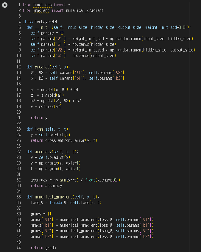 먼저 아래와 같이 TwoLayerNet 클래스를 구현해보자.