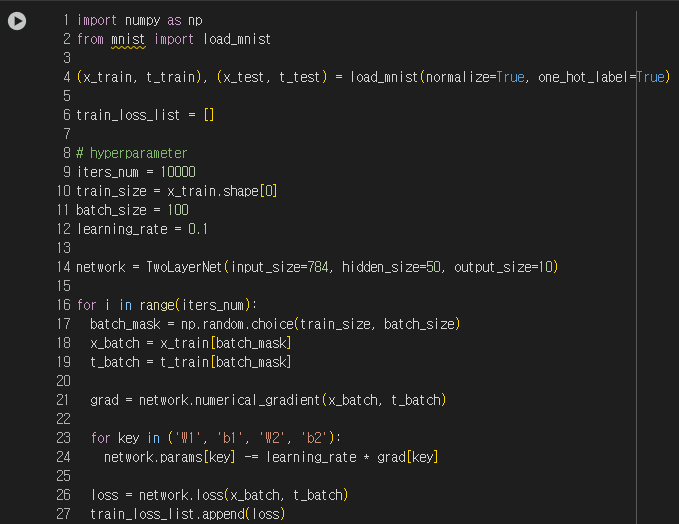 그럼 이제 2층 신경망을 대상으로 MNIST 데이터셋을 사용하여 학습을 진행해보자.