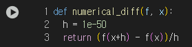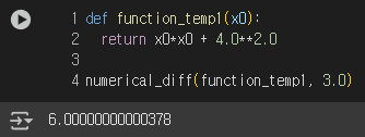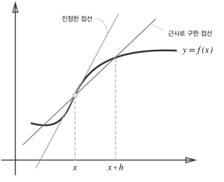 - 아주 작은 값을 주었을 때의 차분으로 미분하는 것을 수치 미분이라고 한다.