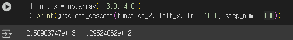 학습률을 0.0000000001로 지정하자, 초기 값인 (-3, 4)에서 크게 이동하지 않았다.