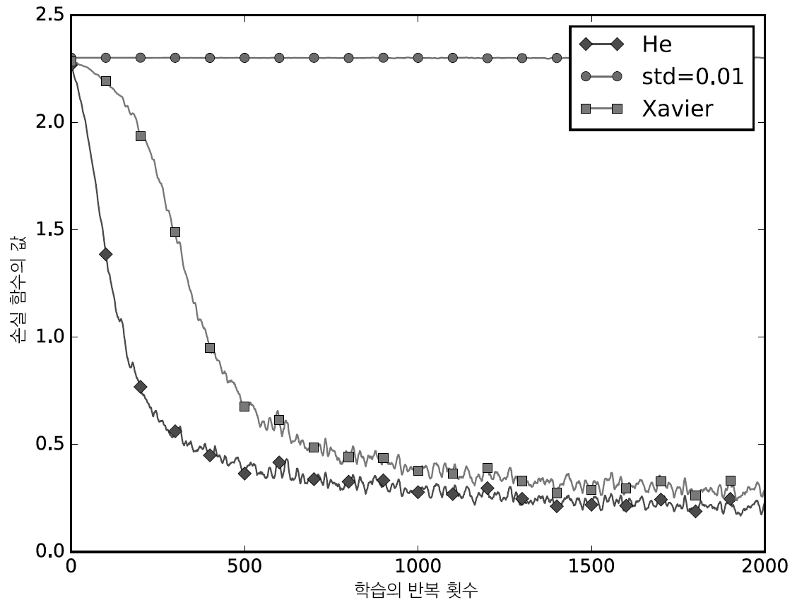 - 가중치의 초깃값으로는 'Xavier 초깃값'과 'He 초깃값'이 효과적이다.