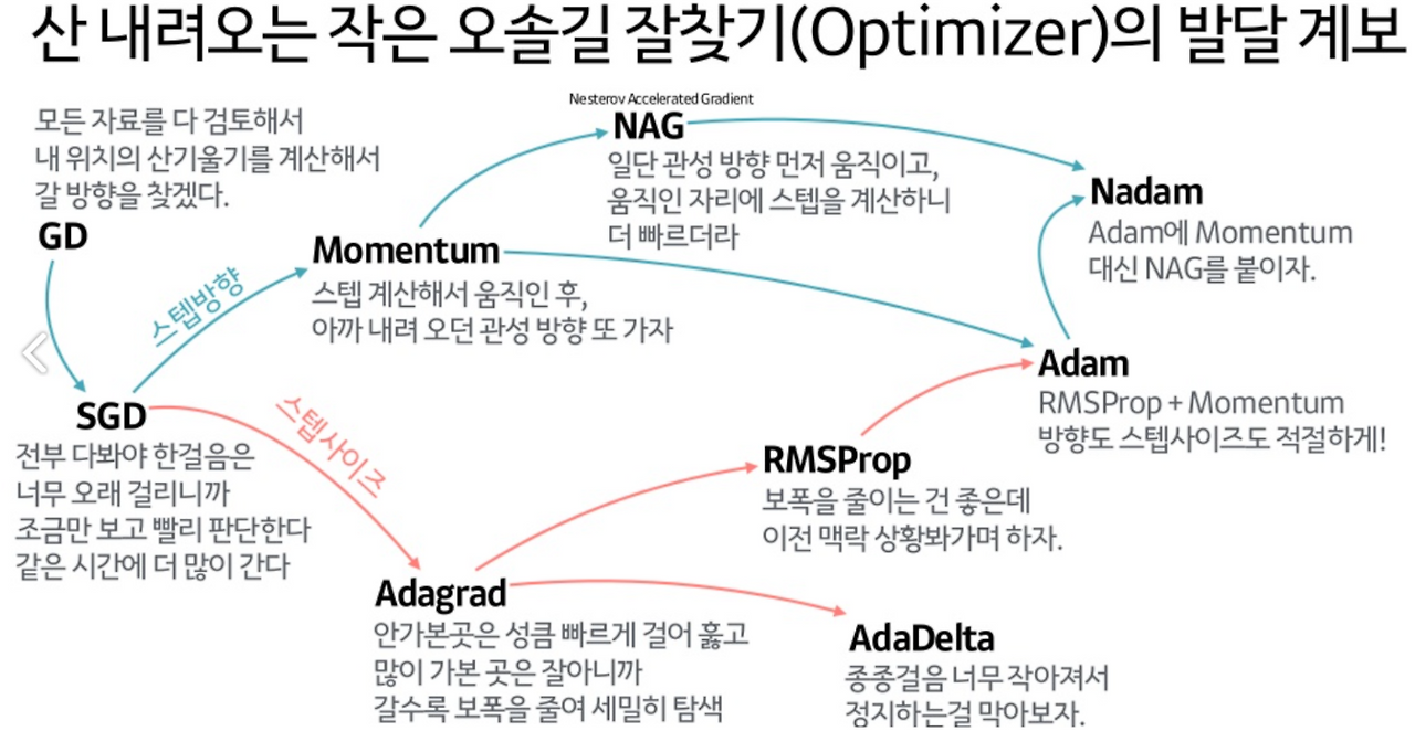- 가중치와 학습 속도를 모두 변경하면서 안정적으로 비용 함수 최솟값 학습