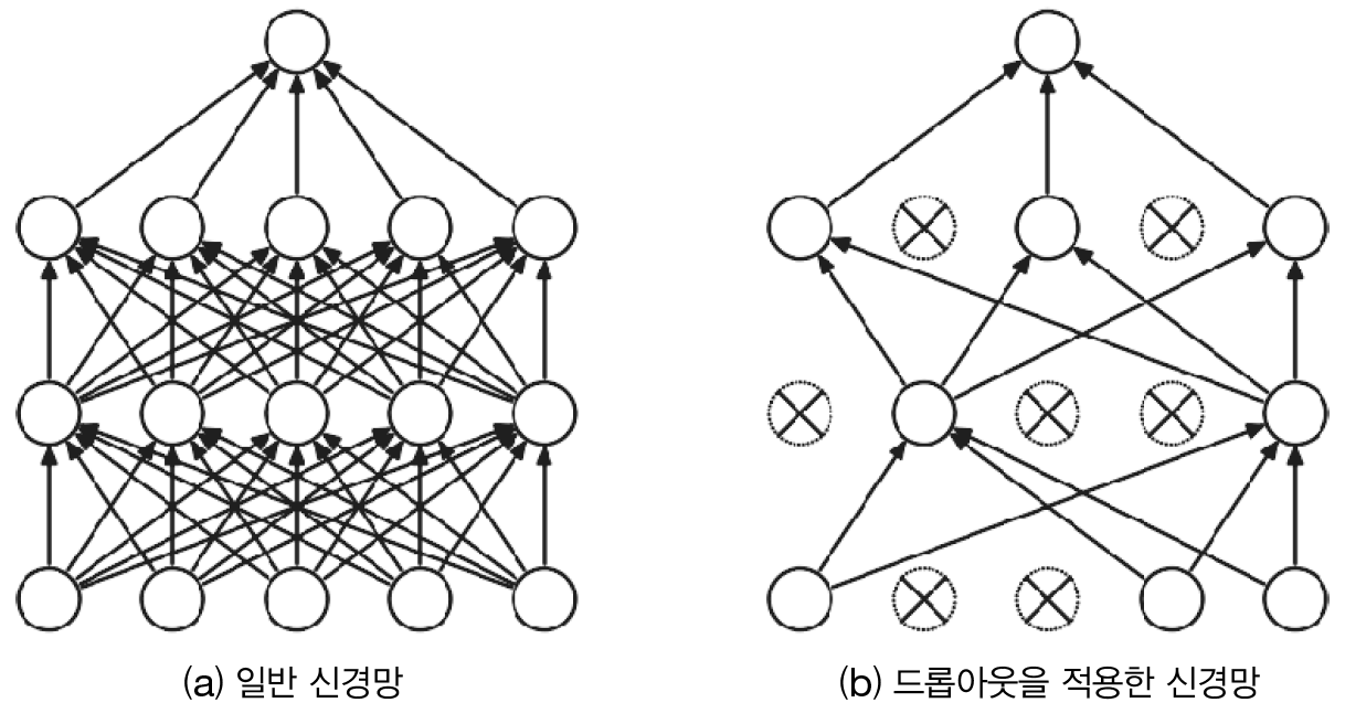 이처럼 드롭아웃을 이용하면 표현력을 높이면서도 과대적합을 억제할 수 있다.